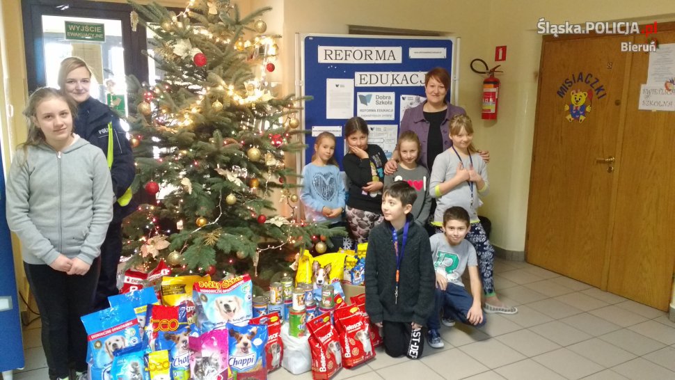 Zbiórka żywności i koców prowadzona była w okresie przedświątecznym. Placówki, które wyraziły chęć uczestnictwa w akcji, przyjmowały wszystko to, co niezbędne dla zwierząt mieszkających w schroniskach. Karmę, przysmaki dla zwierząt, półprodukty spożywcze, koce, pościel, a nawet zabawki i smycze przynieśli uczniowie, przedszkolaki, wychowankowie świetlic i nauczyciele. Tym razem udało się zebrać 337 kg karmy. Poza tym darczyńcy przynieśli dużo niezastąpionych zimą ciepłych okryć, w tym koców, pościeli, ręczników itp. Wszystko to st. sierż. Katarzyna Szewczyk osobiście przekazała do Miejskiego Schroniska dla Zwierząt w Tychach. W schronisku tym przebywa aktualnie 68 psów i 26 kotów. W imieniu własnym oraz pracowników schroniska serdecznie dziękujemy wszystkim, którzy włączyli się do akcji i pomogli w zebraniu tak dużej ilości potrzebnych produktów.