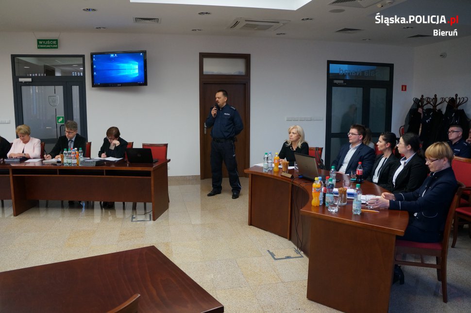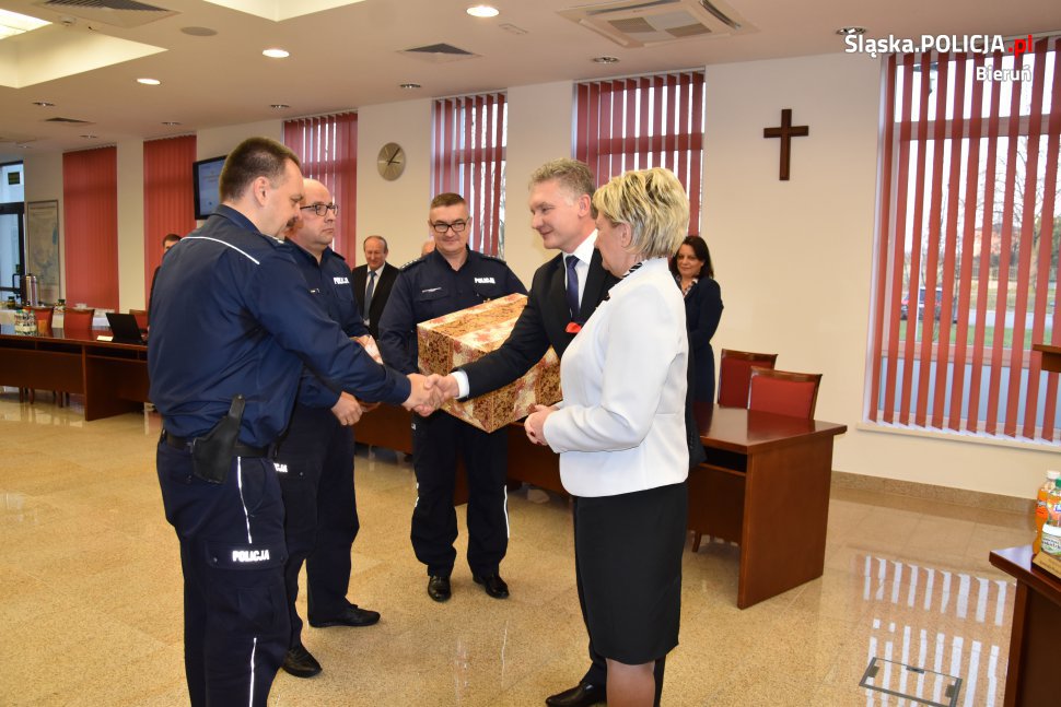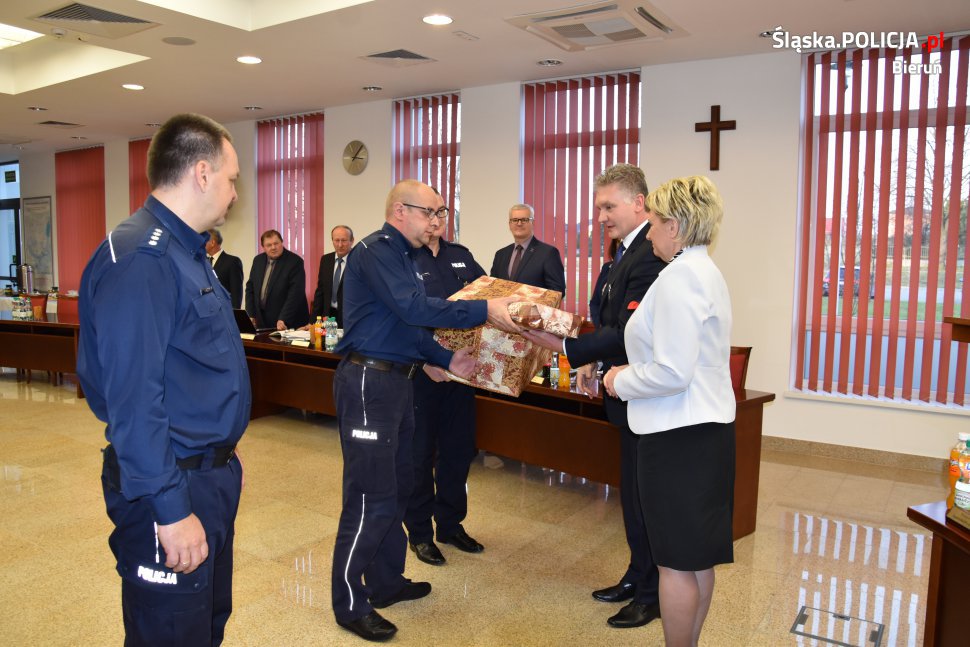 Starosta Bieruńsko-Lędziński zaprosił policjantów na listopadową sesję Rady Powiatu. Celem tak nietypowego spotkania było wręczenie asp. sztab. Tomaszowi Jarczykowi i mł. asp. Krzysztofowi Pawlusiakowi upominków rzeczowych, za to, że w dniach 1 sierpnia i 7 października br. wzorowo wykonali swoje obowiązki służbowe i przyczynili się do uratowania życia dwojga malutkich dzieci, które utraciły wydolność oddechową. W obu przypadkach mundurowi, którzy na co dzień wykonują zadania na stanowisku kierowania, przez telefon instruowali rodziny jak krok po kroku udzielić pomocy maluszkom. W obu też przypadkach, dzięki zdecydowanej i fachowej pomocy mundurowych oraz współpracy rodziców, dzieci odzyskały oddech jeszcze przed przyjazdem karetki pogotowia. Wicestarosta, Pan Mariusz Żołna w imieniu władz powiatu podziękował mundurowym i wyraził słowa uznania. Obecny na tym wydarzeniu Pierwszy Zastępca Komendanta Powiatowego Policji w Bieruniu nadkom. Grzegorz Kocjan podziękował z kolei samorządowcom za uhonorowanie podległych mu policjantów, nie ukrywając dumy z tego, że w bieruńskiej jednostce pracują tak doświadczeni i dobrze wyszkoleni mundurowi.