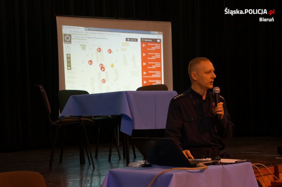 Na zakończenie spotkania lędzińscy uczniowie mieli okazję dowiedzieć się co to takiego "Krajowa Mapa Zagrożeń Bezpieczeństwa", czemu służy to narzędzie i jak prosto oraz skutecznie można z niego skorzystać. Temat związany z mapami omówił asp. szt. Szymon Jeleń, zajmujący się w bieruńskiej komendzie profilaktyką społeczną.