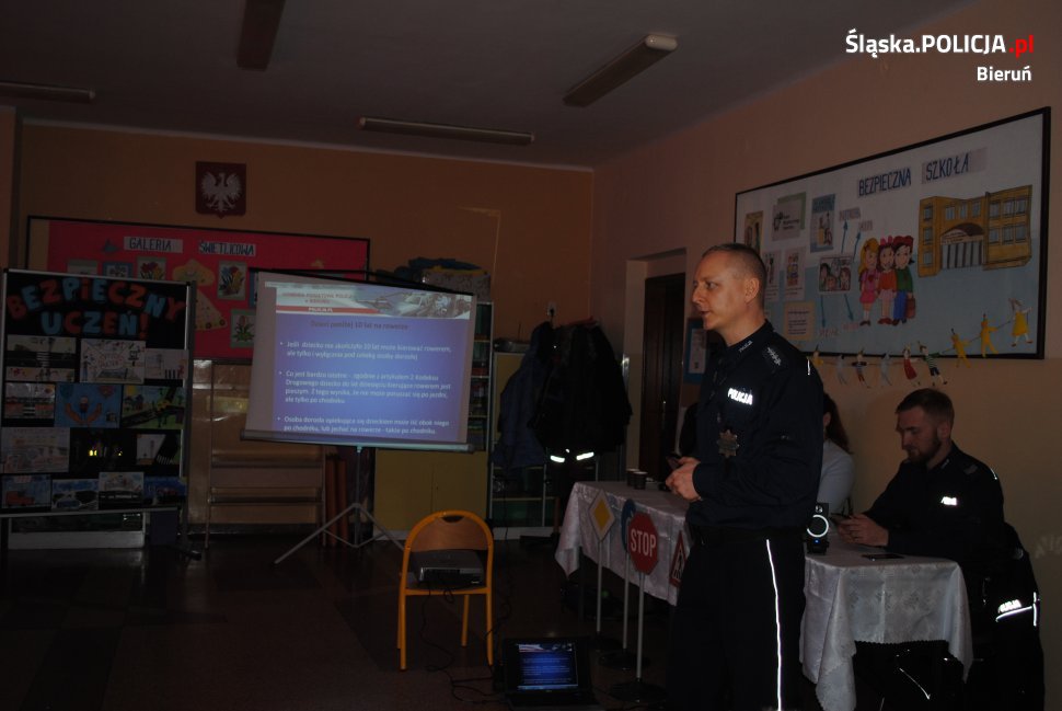 Spotkanie mundurowych z uczniami było również okazją do omówienia tematu związanego z bezpieczeństwem rowerzystów. Z uwagi na to, że trzecioklasiści już niedługo będą mogli ubiegać się o kartę rowerową, asp. szt. Szymon Jeleń przeprowadził krótką pogadankę związaną z bezpieczną jazdą na rowerach, przybliżył przepisy dotyczące rowerzystów oraz starał się uświadomić dzieci, jakie zagrożenia mogą na nie czyhać, kiedy bez opieki dorosłych będą już mogły poruszać się rowerami po ulicach.