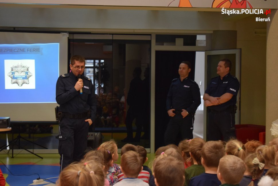 Podczas ostatnich dni przed zbliżającymi się w województwie śląskim feriami, bieruńscy policjanci prowadzili szereg spotkań z dziećmi i młodzieżą powiatu bieruńsko-lędzińskiego. Przeprowadzone przez nich prelekcje związane były z szeroko pojętym bezpieczeństwem w trakcie zimowego wypoczynku. Policjanci przypominali dzieciom o bezpiecznych zasadach korzystania ze ślizgawek, kuligów i innych form aktywnego spędzania czasu zimą. Poruszyli też temat bezpieczeństwa w ruchu drogowym oraz ostrzegli przed niebezpieczeństwem kontaktów z osobami obcymi. Prelekcje odbyły się w ramach ogólnopolskiej akcji "Bezpieczne Ferie 2019".
