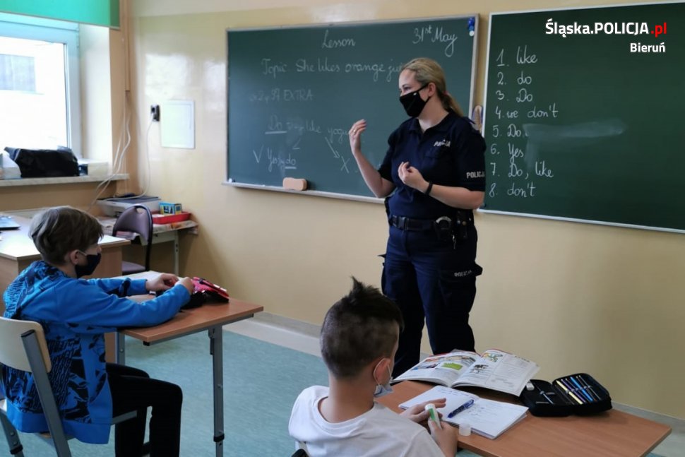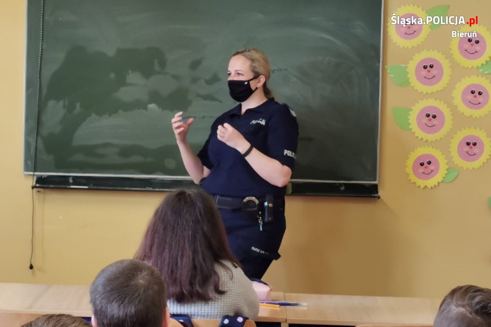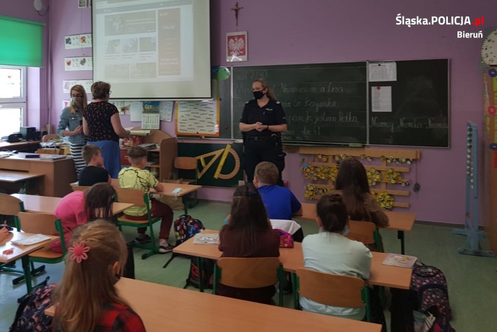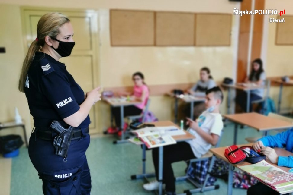 W ostatnich dniach policyjni profilaktycy odwiedzili uczniów klas 2 – 5 ze Szkoły Podstawowej nr 1 w Bieruniu. Ze względu na obowiązujące jeszcze obostrzenia związane z pandemią, spotkania podzielone były na dwa dni, a każda klasa miała indywidualną pogadankę z mundurowymi.