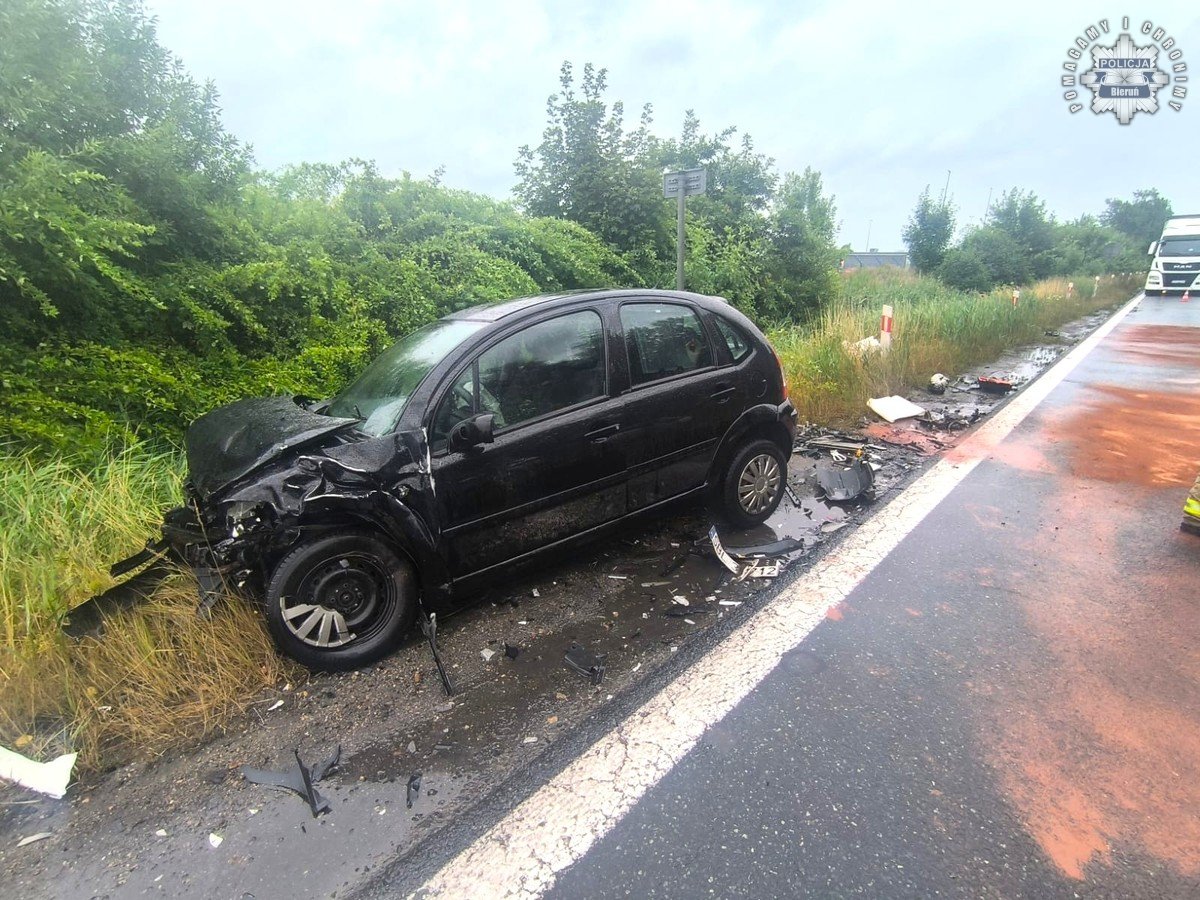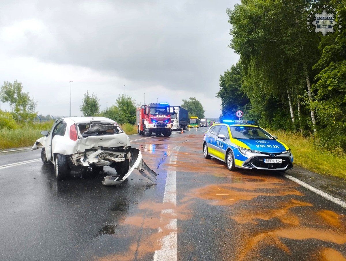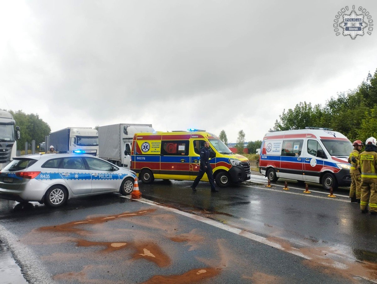 Do zdarzenia doszło wczoraj, około 15:30 na ulicy Turyńskiej w Bieruniu. 21-letni mężczyzna kierujący osobowym fiatem w wyniku niedostosowania prędkości do panujących warunków na drodze, stracił panowanie nad pojazdem i uderzył w naczepę ciągnika siodłowego marki Daf, a następnie uderzył w osobowego citroena. W wyniku zdarzenia dwie osoby zostały zabrane do szpitala. Droga w miejscu zdarzenia była całkowicie zamknięta od godziny 15:30 do 20:20.