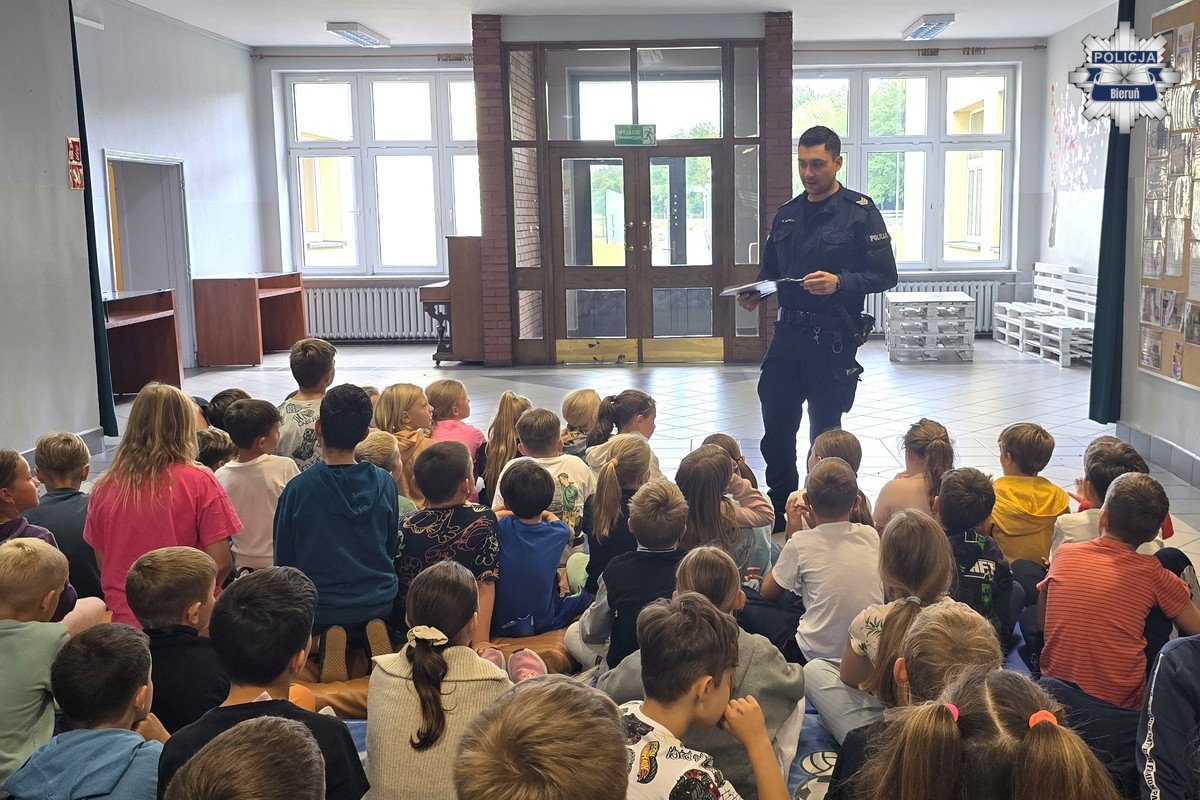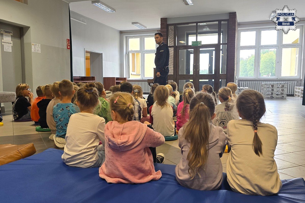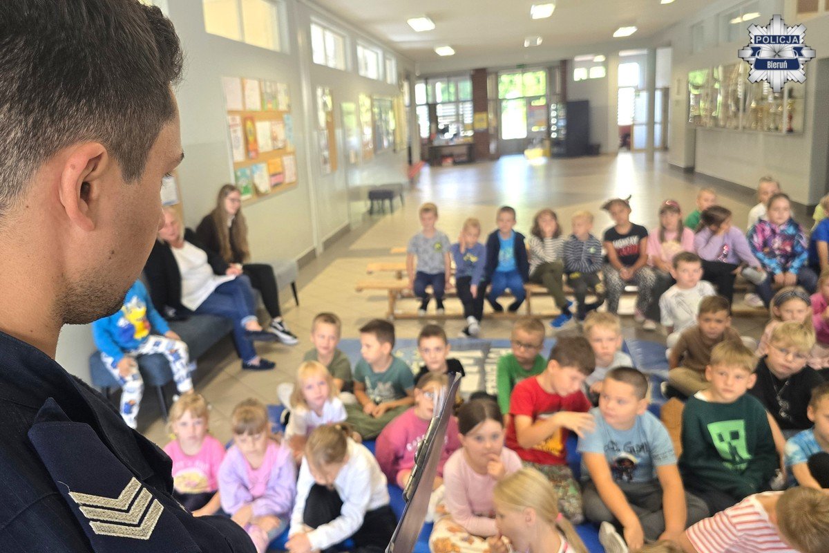 Głównym tematem prelekcji przeprowadzonych przez bieruńskiego mundurowego było bezpieczeństwo dzieci w drodze na zajęcia szkolne oraz podczas powrotu do domu. Policjant przypomniał uczniom o obowiązku przechodzenia przez pasy i stosowania się do sygnalizacji świetlnej. Uczył też, jak poruszać się po jezdni w przypadku braku chodnika lub pobocza. Nieodzownym elementem każdej pogadanki z dziećmi jest zwrócenie uwagi najmłodszych na korzyści płynące z noszenia odblasków i bycia widocznym na drodze. Mundurowy udzielał wskazówek dotyczących prawidłowych zachowań w kontaktach z osobami nieznajomymi, właściwego, a co za tym idzie, bezpiecznego korzystania z rowerów, hulajnóg i deskorolek, a także bezpieczeństwa najmłodszych podczas podróży samochodem.