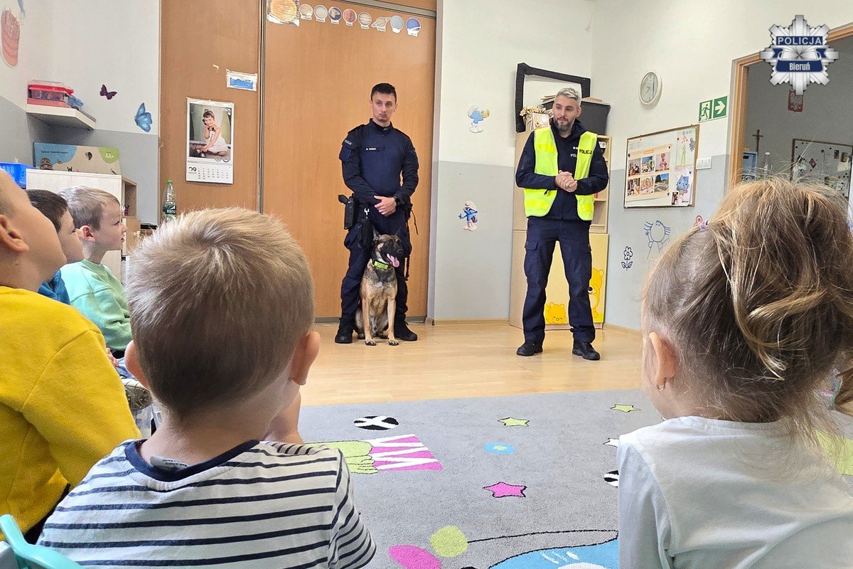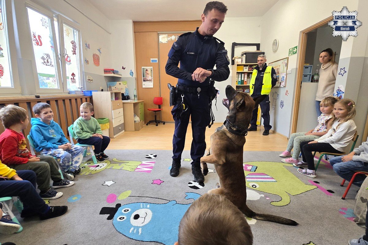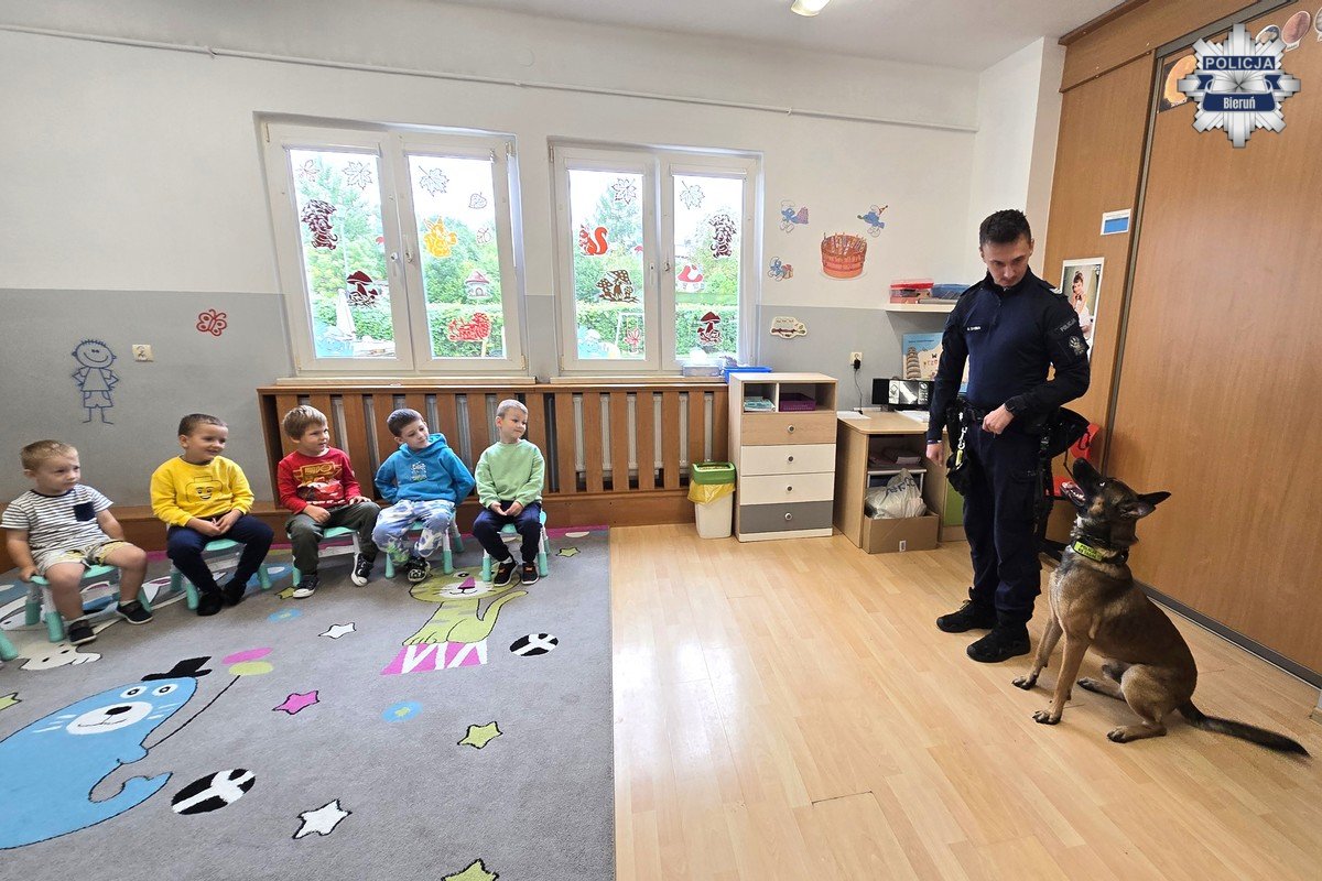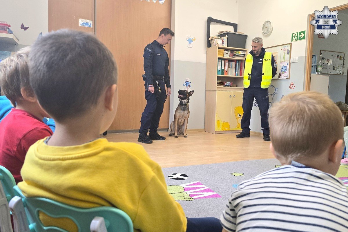 Specjalista z bieruńskiej drogówki podkomisarz Bartłomiej Kryjak wraz z policyjnym przewodnikiem psa z Komendy Miejskiej Policji w Katowicach sierżantem sztabowym Dominikiem Syska odwiedzili dzieci z przedszkola Karolek w Bieruniu oraz podopiecznych z Ośrodka Błogosławiona Karolina. Mundurowi przygotowali dla uczestników prelekcję na temat szeroko rozumianego bezpieczeństwa oraz pokaz posłuszeństwa psa służbowego Lotus.