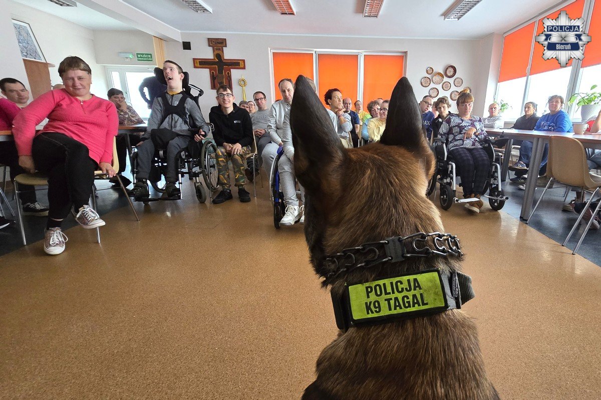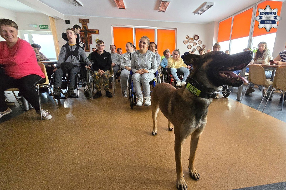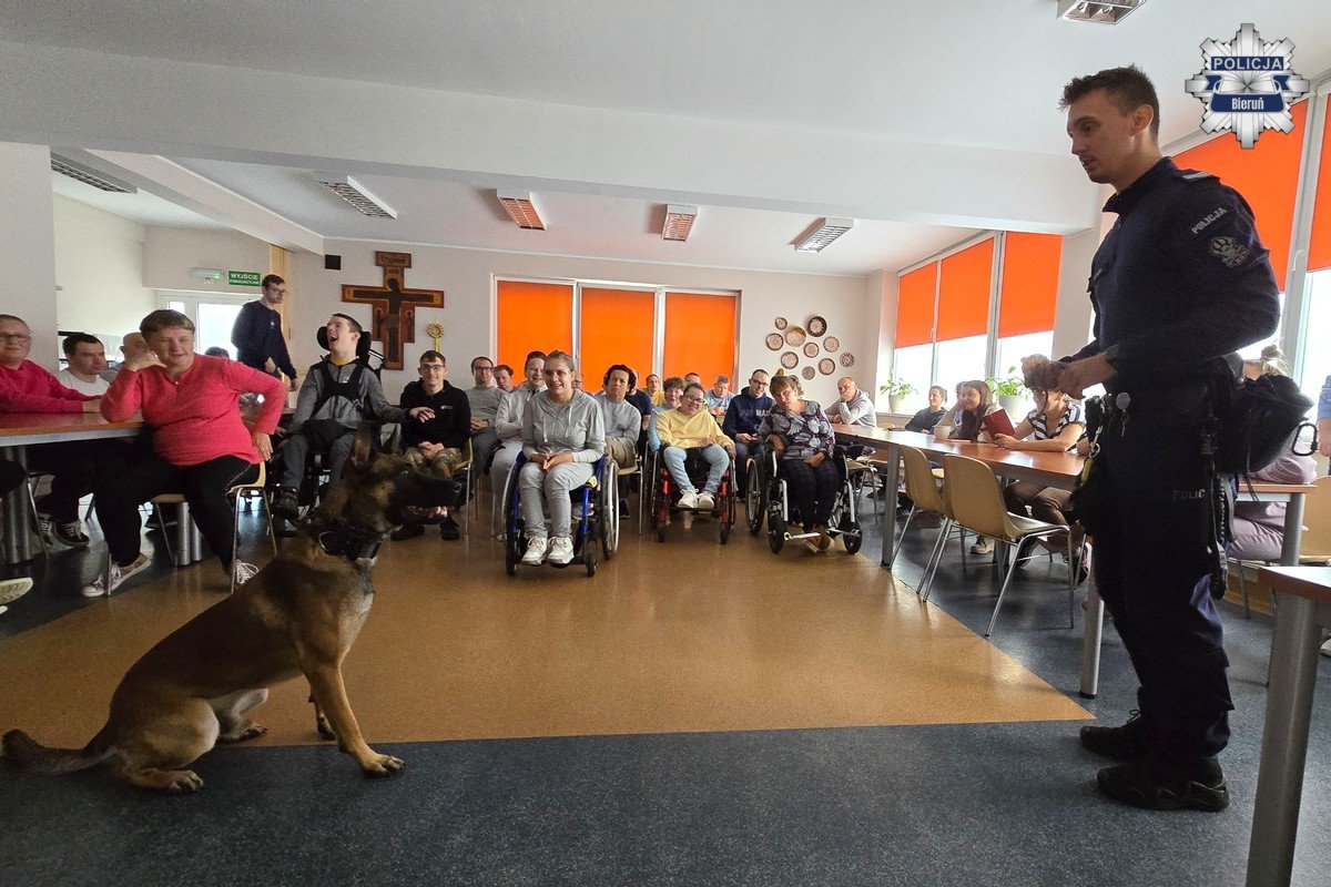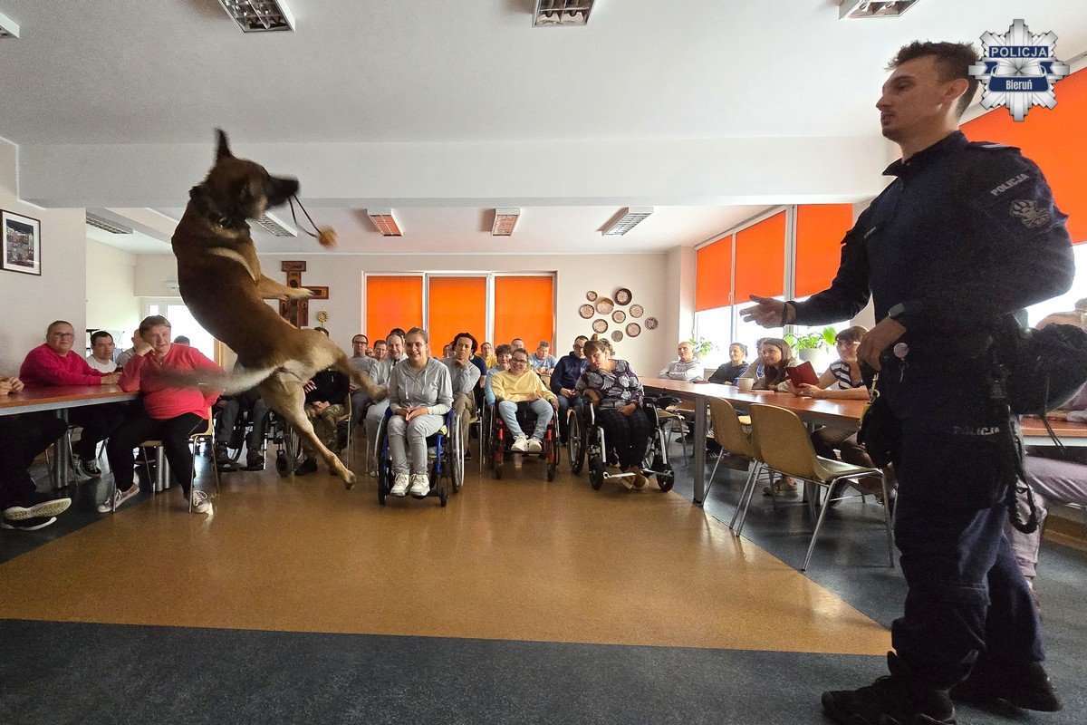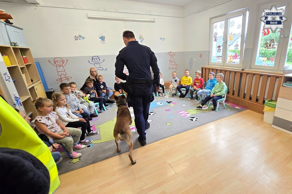 Specjalista z bieruńskiej drogówki podkomisarz Bartłomiej Kryjak wraz z policyjnym przewodnikiem psa z Komendy Miejskiej Policji w Katowicach sierżantem sztabowym Dominikiem Syska odwiedzili dzieci z przedszkola Karolek w Bieruniu oraz podopiecznych z Ośrodka Błogosławiona Karolina. Mundurowi przygotowali dla uczestników prelekcję na temat szeroko rozumianego bezpieczeństwa oraz pokaz posłuszeństwa psa służbowego Lotus.
