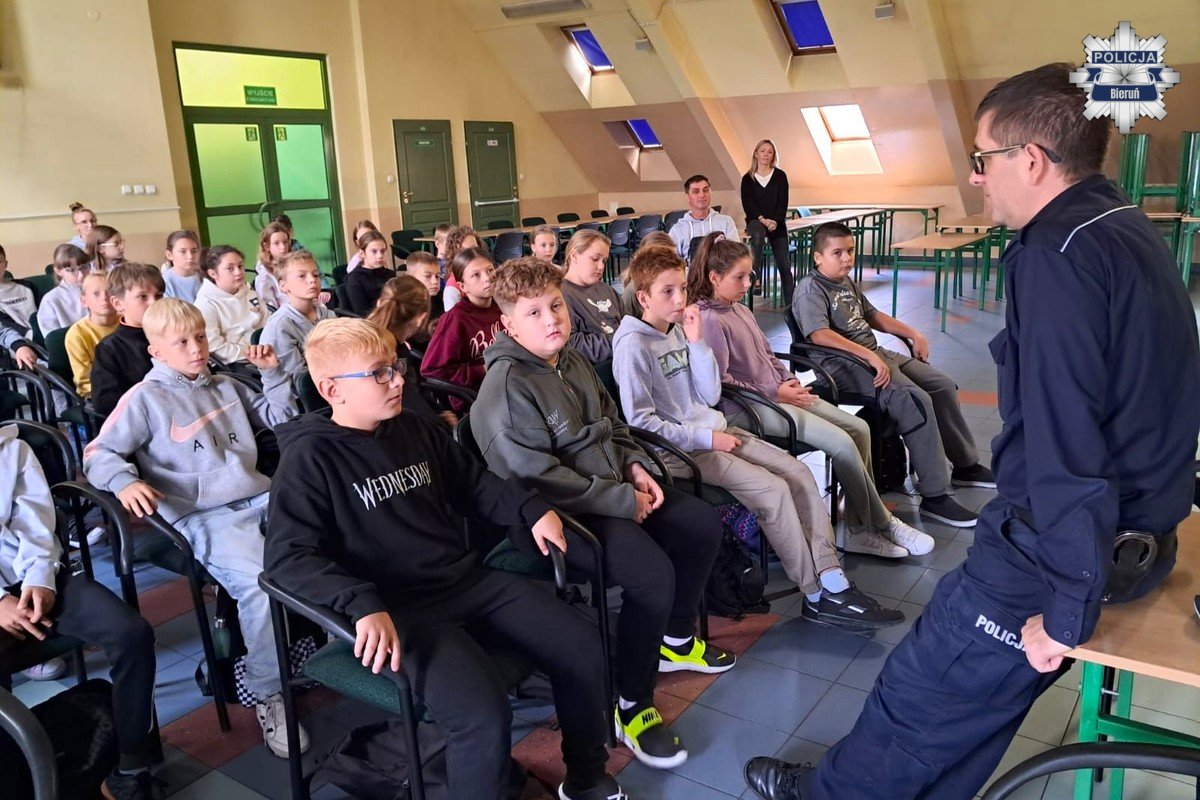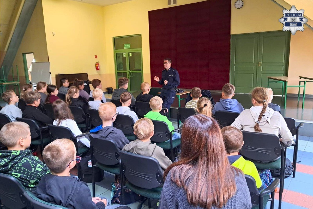 W czwartek bieruński profilaktyk przeprowadził przygotowanie do karty rowerowej dla uczniów klas czwartych ze Szkoły Podstawowej w Bojszowach. Uczniowie z dużym zainteresowaniem słuchali policjanta oraz aktywnie uczestniczyli w profilaktyce. Mundurowy przypomniał najważniejsze zasady poruszania się po drodze między innymi: