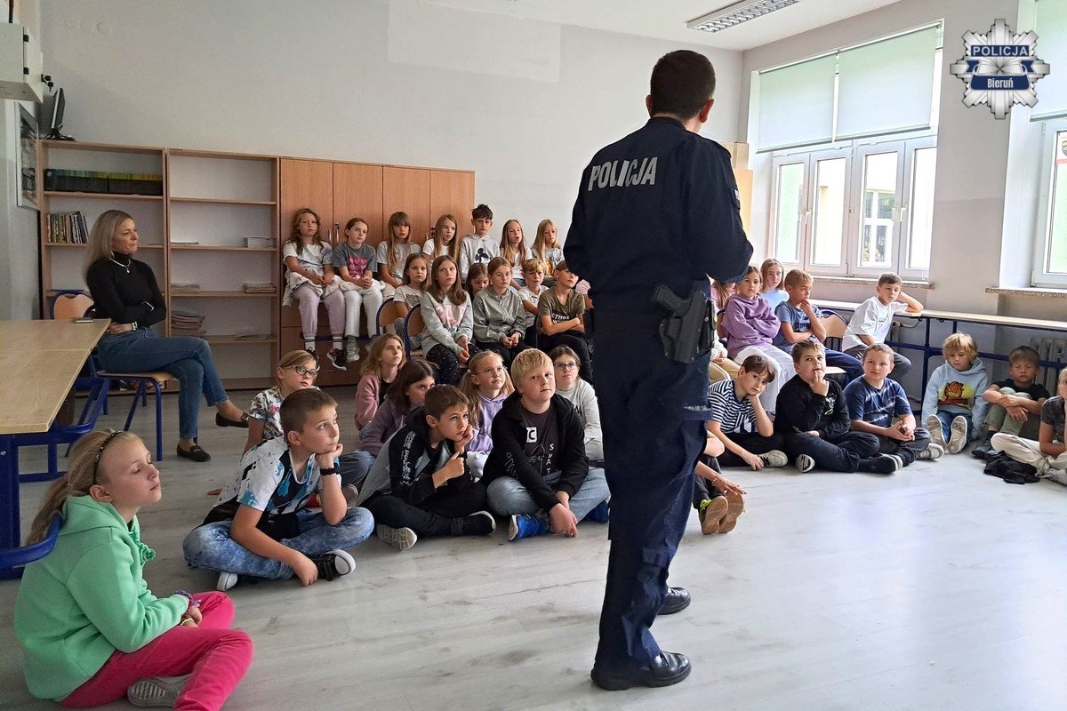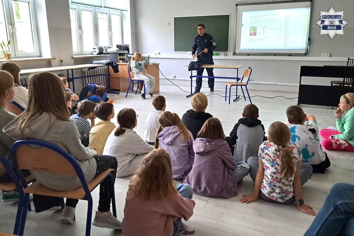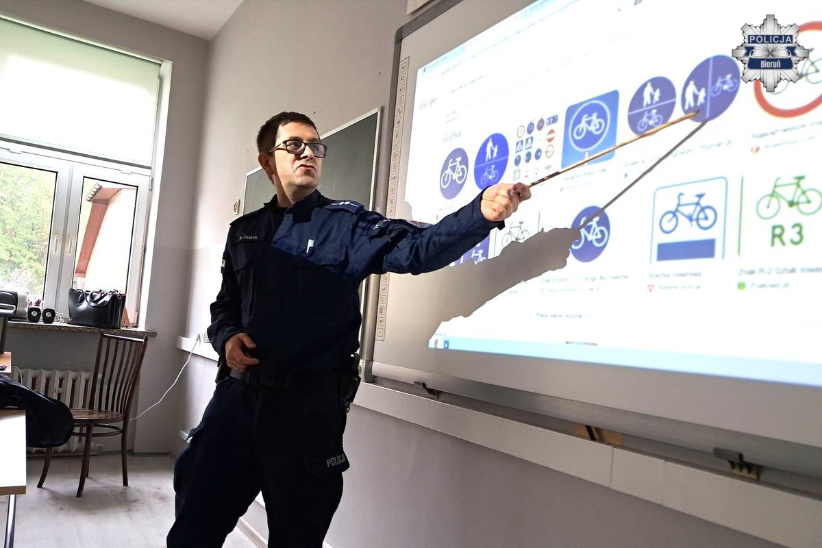 Bieruński profilaktyk przeprowadził zajęcia, które mają na celu przygotowanie do karty rowerowej uczniów klas czwartych ze Szkoły Podstawowej w Świerczyńcu. Dzieci z dużym zainteresowaniem słuchały policjanta oraz aktywnie uczestniczyły w profilaktyce.
