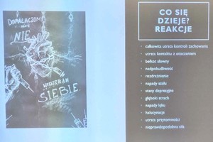 Na specjalnie przygotowanej prezentacji multimedialnej, młodzież mogła zobaczyć rodzaje szkodliwych substancji, a także ludzi, których zażywanie narkotyków doprowadziło do zrujnowania zdrowia.