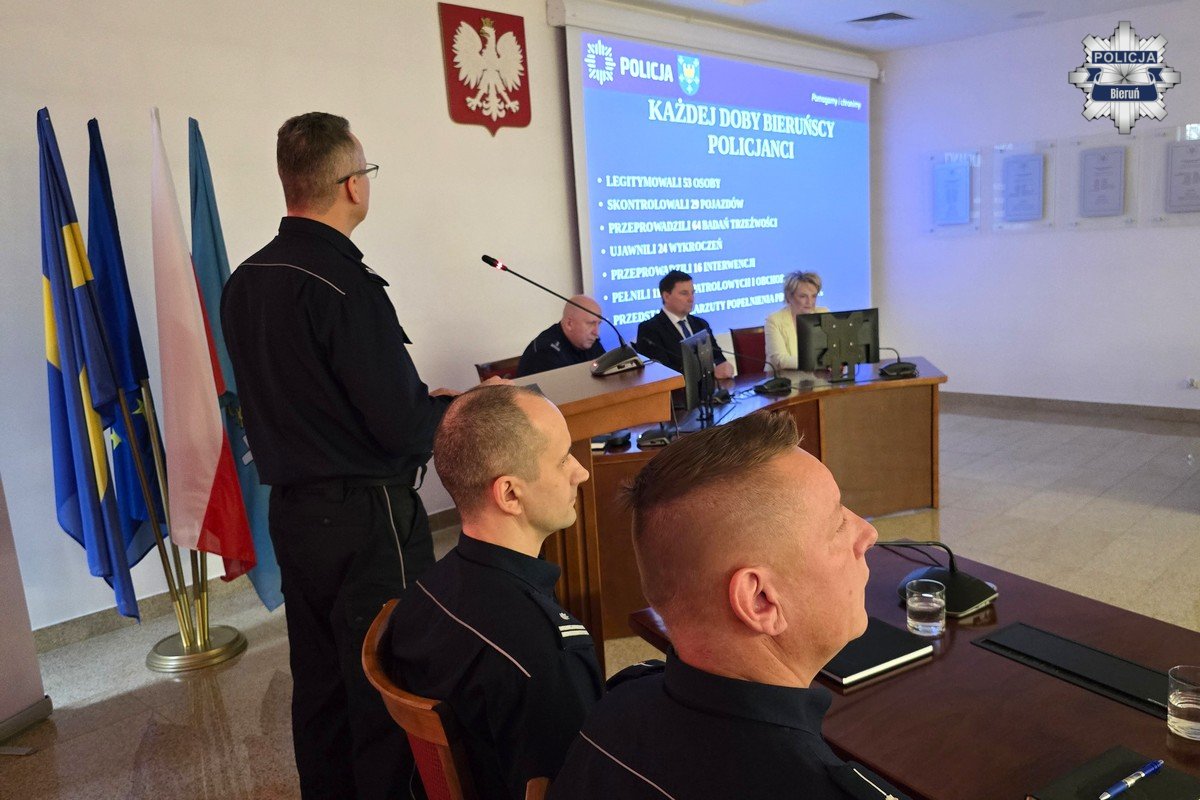 Na zakończenie odprawy głos zabrał Zastępca Komendanta Wojewódzkiego Policji w Katowicach inspektor Jacek Stelmach. Pan Komendant podziękował bieruńskim policjantom za ciężką pracę jaką wykonali oraz gratulował osiągnięcia wysokich wyników. Podziękował również samorządowcom i przedstawicielom zaprzyjaźnionych służb mundurowych, za wzorową współpracę na rzecz poprawy lokalnego bezpieczeństwa.