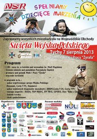 Informujemy, że w dniu 7 sierpnia w Tychach na terenie Parku Miejskiego "Pod Żyrafą" odbędą się Wojewódzkie Obchody Święta Wojska Polskiego. W imieniu organizatorów serdecznie zapraszamy wszystkich chętnych do udziału w obchodach, które rozpoczną się o godzinie 11:00 mszą świętą w kościele pw. św. Marii Magdaleny w Tychach. Program uroczystości przewiduje liczne atrakcje, m.in. pokazy sprzętu wojskowego, skoki spadachronowe, występy zespołów i wiele innych.